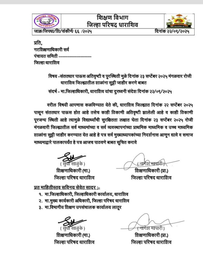 👉 उद्या, २३ सप्टेंबर रोजी धाराशिव जिल्ह्यातील कोणतीही शाळा सुरू राहणार नाही.
