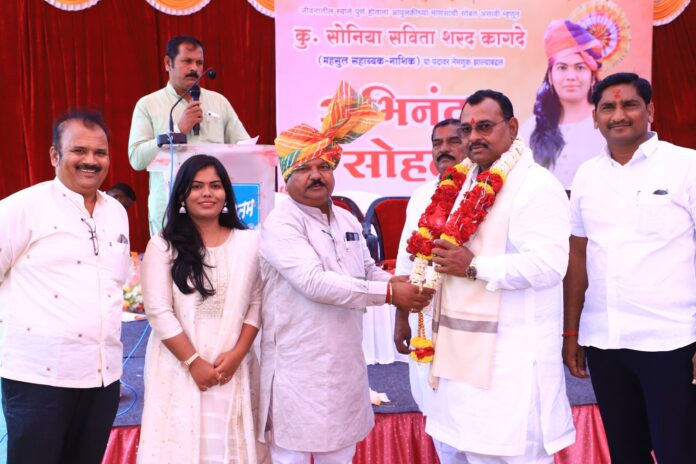 माळशिरस तालुक्यातील दसुर गावच्या एका गरीब कुटुंबातील मुलगी कु. सोनिया शरद कागदे यांनी शैक्षणिक गुणवत्तेच्या जोरावर यश मिळवत नुकतीच महसूल सहायक या पदावर नाशिक येथे त्यांची प्रशासनामार्फत नियुक्ती करण्यात आलेली आहे, त्यांच्या या यशाबद्दल पै.दत्ता मगर यांच्याकडून कुमारी सानिया शरद कागदे यांचा व त्यांच्या कुटुंबीयांचा जंगी सामान सोहळा कार्यक्रमाचे आयोजन करण्यात आले होते यावेळी व्यासपीठावर आमदार पाटील बोलत होते. यावेळी सत्कार करण्यासाठी बळीराजा प्रतिष्ठानचे संस्थापक अध्यक्ष व भावी जिल्हा परिषद सदस्य दत्ता भैया मगर मित्र परिवाराच्या वतीने त्यांचा सन्मान व सत्कार करण्यात आला.यावेळी कागदे कुटुंबाच्या सत्कारासाठी माढा विधानसभा मतदारसंघाचे लाडके आमदार अभिजीत आबा पाटील तसेच त्यांच्याबरोबर उमेश मालक परिचारक, जानकर, दत्ता भैया मगर, अभिराज पूर्वत, युवराज अंधारे यासह मान्यवरांची प्रमुख उपस्थिती होती