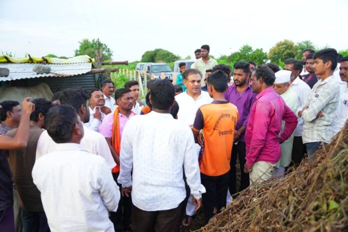 कळंब, वाशी आणि भूम तालुक्यात पुन्हा एकदा अतिवृष्टीने धुमाकूळ घातला आहे. कळंब तालुक्यातील बहुतांश गावामध्ये अतिवृष्टी झाली आहे. त्यामुळे तेरणा नदी पात्र सोडून ओसंडून वाहत आहे. पाण्याचा भला मोठा प्रवाह नदीपात्रा बाहेरून वाहत असल्याने सगळ्या शिवारात पाणी शिरले आहे. इटकूर परिसरातील वाशीरा नदीही पात्र सोडून एक किलोमीटर अंतरावरून वाहत आहे. त्यामुळे नदीकाठच्या घरांचे, दुकानांचे आणि शेतशिवाराचे अतोनात नुकसान झाले आहे. कळंब तालुक्यातील देवळाली, ढोराळा परिसरात झालेल्या नुकसानीची प्रत्यक्ष पाहणी केली. शेतकऱ्यांच्या व्यथा आणि वेदना जाणून घेतल्या. या संकटकाळात ठामपणे त्यांच्यासोबत उभे असल्याचा विश्वास दिला. सर्वांना सरसकट मदत मिळेपर्यंत आपण पाठपुरावा करीत राहणार असल्याचेही आमदार राणाजगजितसिंह पाटील यांनी सांगितले आहे.