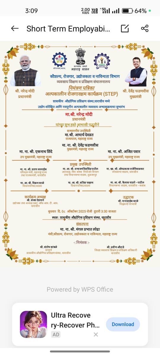 या कार्यक्रमांतर्गत भाई उद्धवराव पाटील शासकीय आयटीआय धाराशिव येथे आधुनिक तंत्रज्ञानाशी निगडित अभ्यासक्रमांचा समावेश असून यात इलेक्ट्रिक डोमेस्टिक सोलुशन, बॅटरी सिस्टीम रिपेअर टेक्निशियन, डिजिटल मित्र , टू व्हीलर सर्विस टेक्निशियन, ब्युटी थेरपीस्ट, योगा ट्रेनर इत्यादी विषयांचा समावेश करण्यात आला आहे. नाशिक येथे होणारा कुंभमेळा लक्षात घेऊन “वैदिक संस्कार ज्युनियर असिस्टंट” हा विशेष अभ्यासक्रमही राबविण्यात येईल.